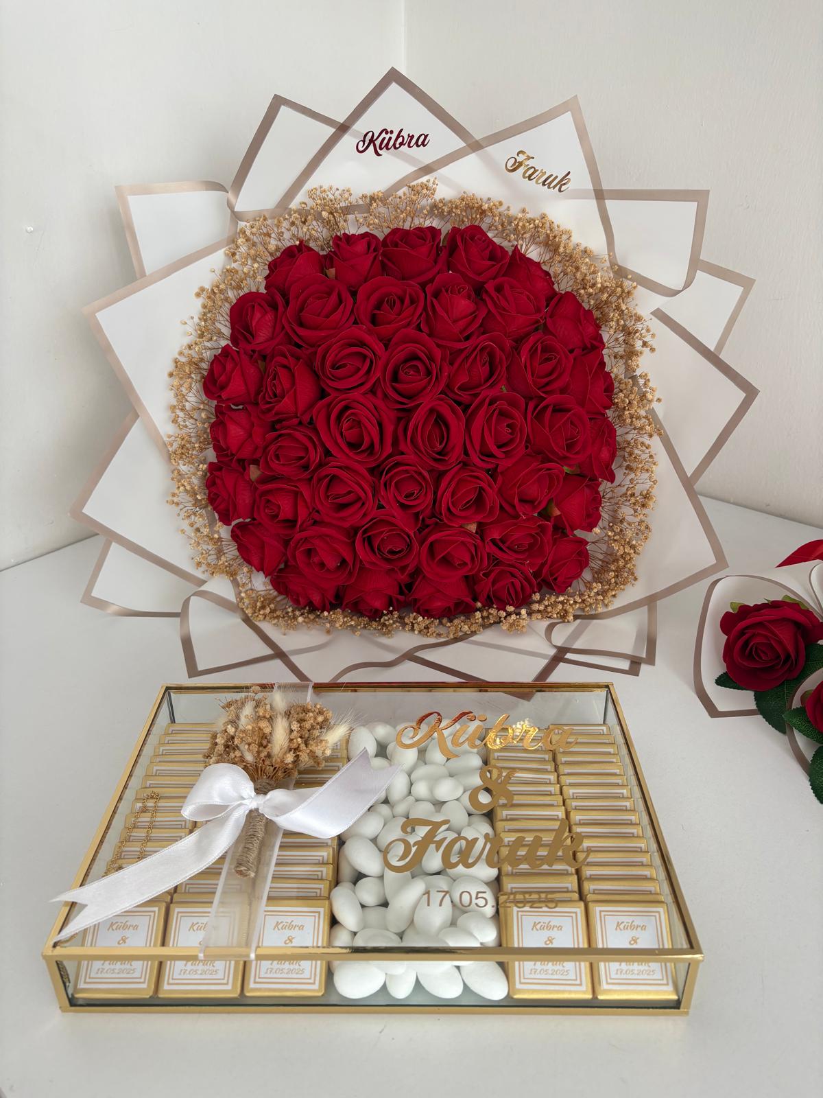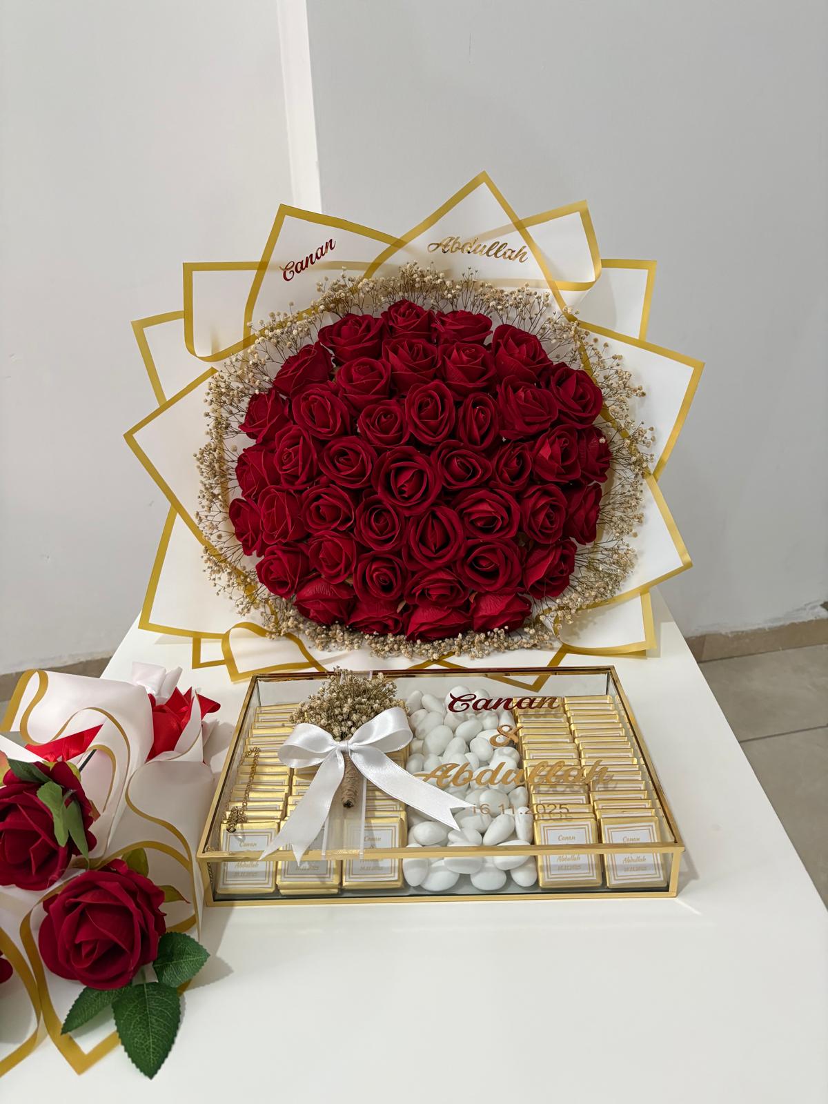 41’li isim baskılı kırmızı kadife gül buketi ve 80 adet madlen çikolata